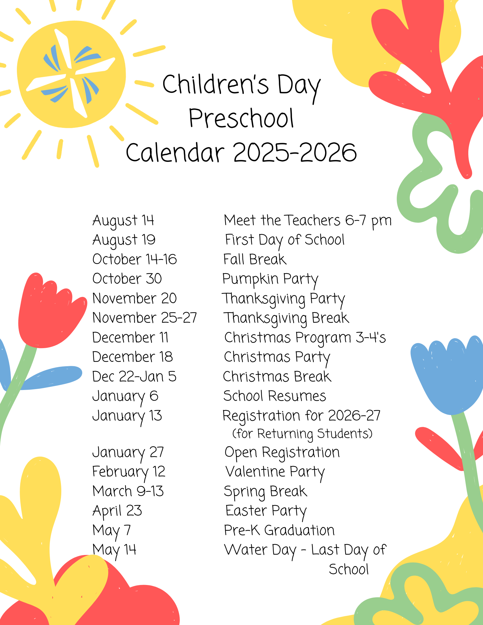 Enrollment for the 2026 fall semester begins January 13, 2026, for families currently enrolled in Children's Day and First Baptist Friendswood members. Open registration begins Tuesday, January 27, 2026, and continues until all classes are full. Parents must complete all forms and pay the fees required for registration to secure a spot in the Children's Day program. Fees may be paid by check, cash, money order or online. Monthly tuition fees may also be paid in the same manner. Checks and money orders should be made payable to First Baptist Friendswood with Children's Day noted in the memo line. Credit card payments can only be made online by following the "Pay Online" link at the top of this page.